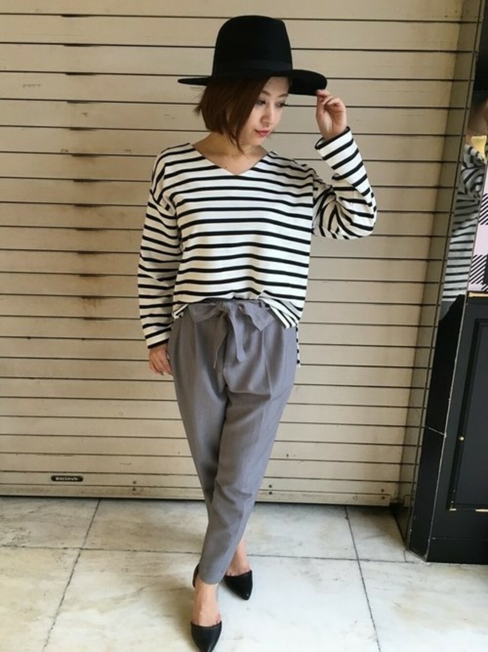 トレンドのゆるっとしたシルエットが可愛いトップスは肉厚な生地感が着心地抜群です。 パンツもストレッチが効いていて履きやすいですよ。 モノトーンで合わせて大人っぽいコーディネートにしました。