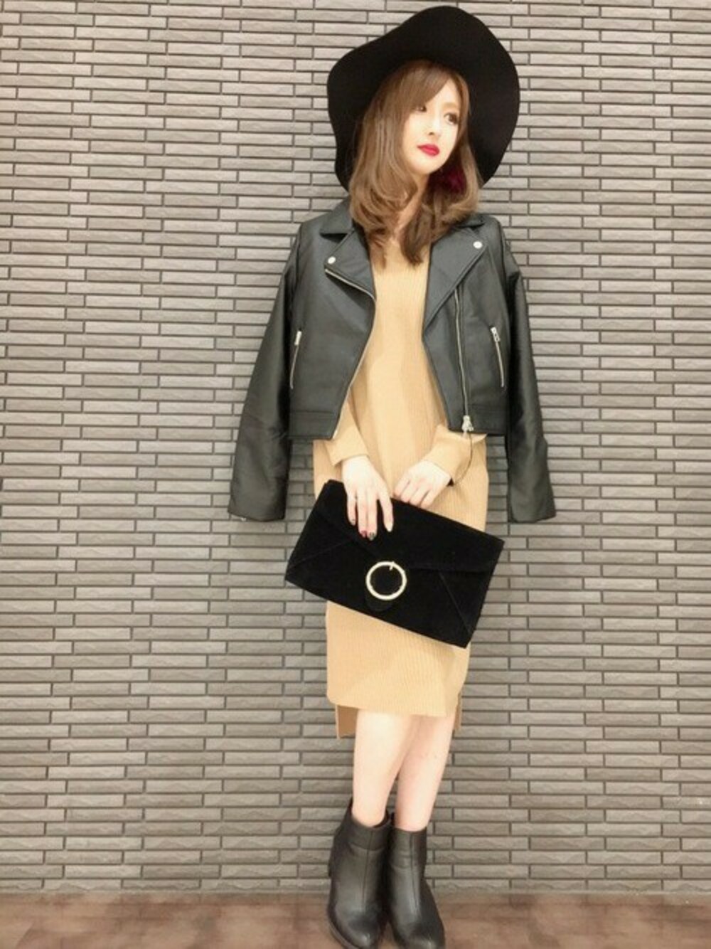 シンプルなニットワンピースは、前と後ろの長さが違うイレヘムの型で差をつけれる一枚.+° クールなライダースジャケットと合わせると大人レディなコーディネートに♪”