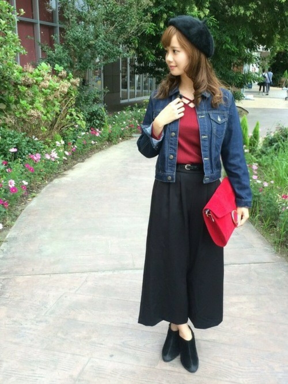 大人気のレースアップデザインのトップスをインナーに着てみました♪ Gジャンとボルドーの組み合わせは秋にぴったりです! スカンツはウエストがゴムなので履き心地も抜群ですよ☆