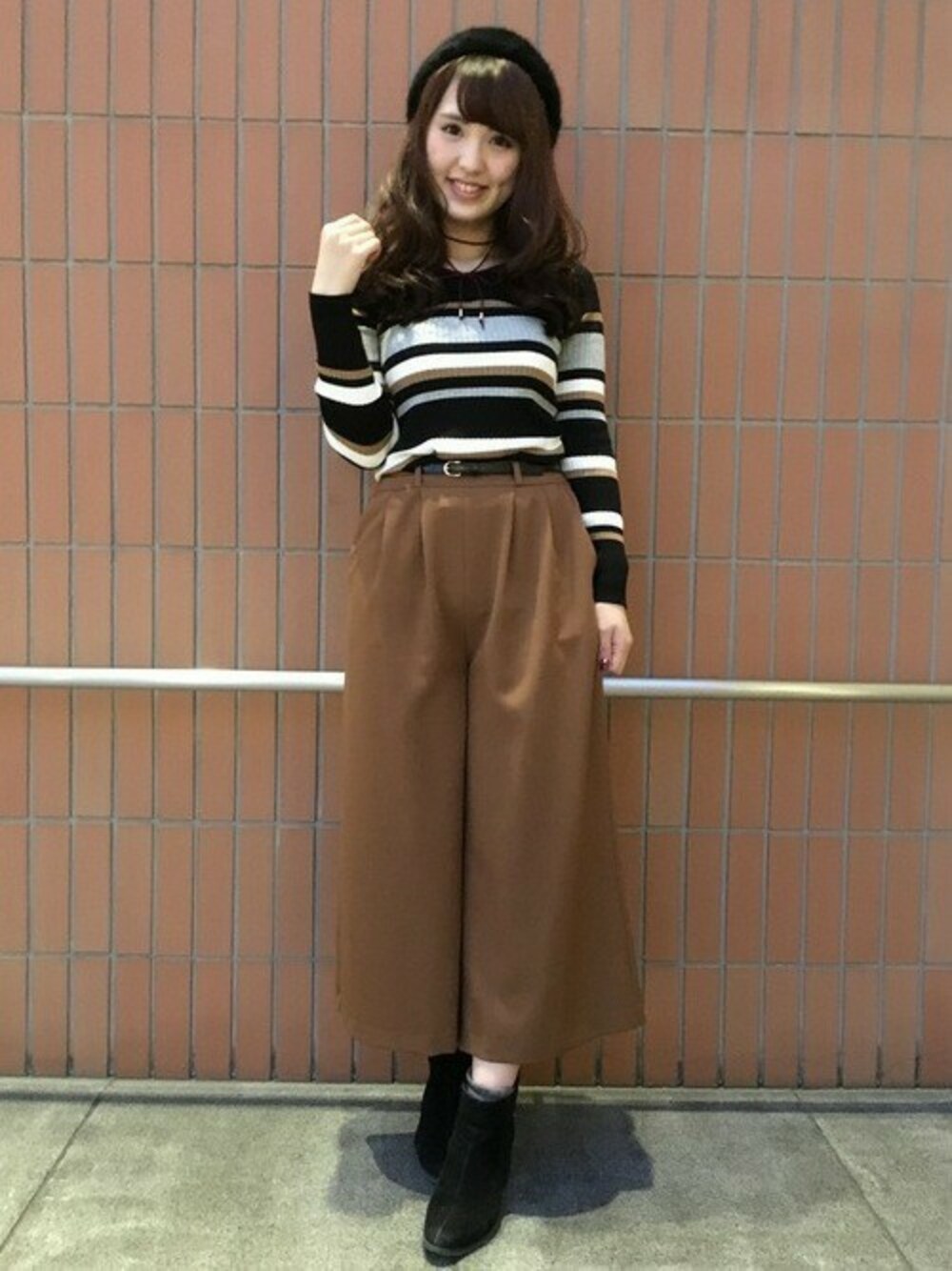 スカンツはウエストがゴムで履き心地抜群です!ガウチョよりも長めの丈感で脚長効果も期待できます♡ マルチボーダーのニットはこれだけで存在感があるのでシンプルなスカンツと相性抜群です♡ 色味もキャメル系で合わせることでコーデ(統一感が出せます!