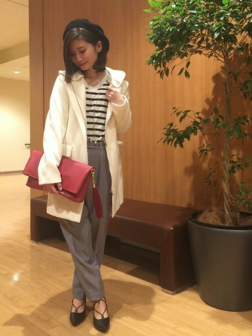 首元まで閉まり、フードもついているの防寒もばっちり! フードが取り外し可能なのでノーカラーコートとしてもお使いいただけます。 テーパードパンツとベーシックなニットのあわせで大人っぽく仕上げました。