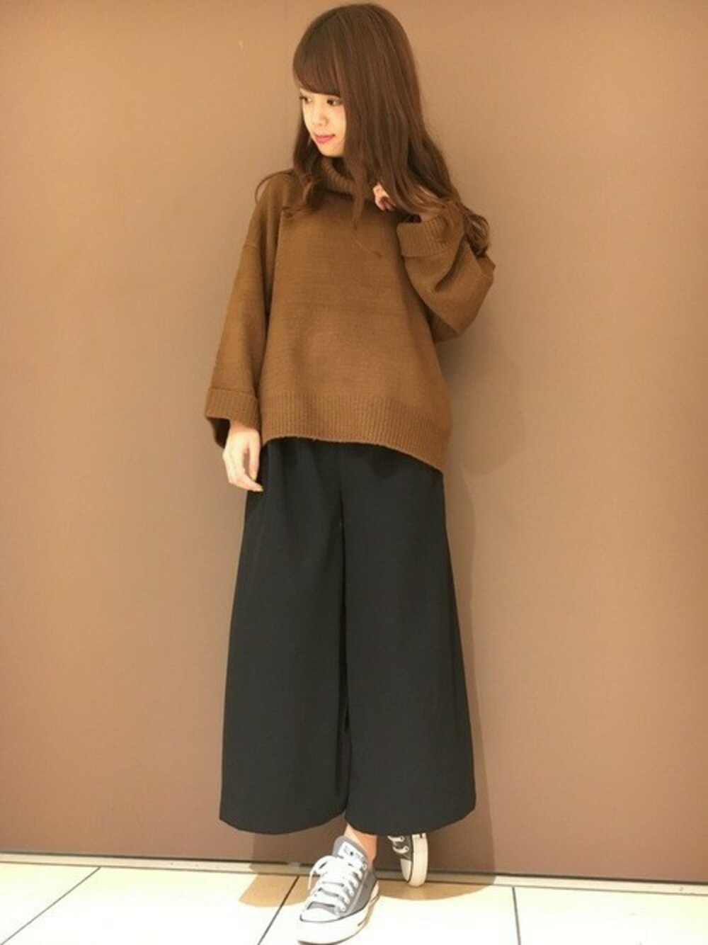 ニットはふんわりとした手触りでオーバーシルエットがポイントです! 袖部分は折り返しになっているので手首をすっきり見せてくれます! ブラウン×クロで落ち着いた色味でコーディネートしました!