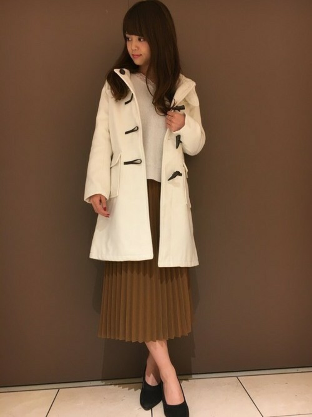 ニットの首元にレースをあしらったアイテムです。 重ね着のようですが一枚で着れるのが嬉しいポイントです! インナーとコートをオフホワイトのワントーンコーディネートにしました!