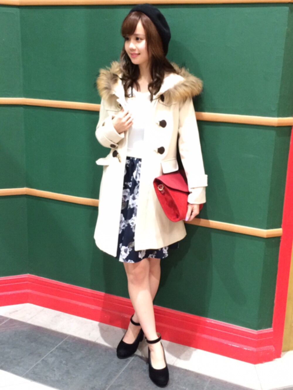 ファー付きのコートを合わせ、デートにぴったりのスタイルに♫ 花柄ワンピースはオフショルになっており、1枚でコーディネートが決まります☆