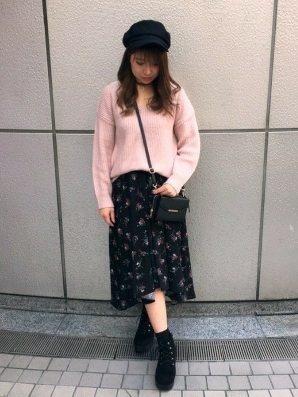 ビックニットや長めのスカートに小さなバックを合わすコーデは旬で春先取りコーデを意識してみました。 花柄イレヘムスカートはゆらゆら歩くと靡くのがとても可愛いです。