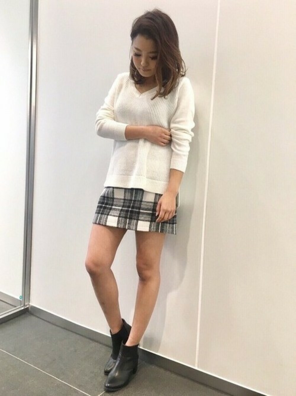 全体に大きく入ったチェック柄が目を引く台形スカートは、シャギー素材なので女性らしくよりフェミニンな印象を与えてくれます。 ゆったりめのニットと合わせて、少し大人っぽく仕上げました