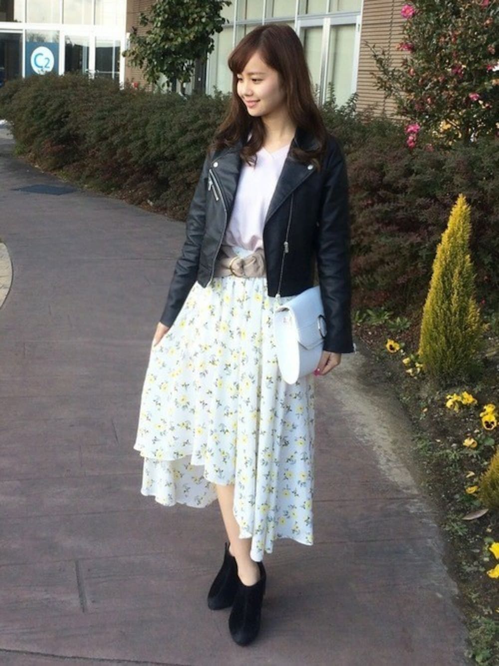 花柄×ピンクの組み合わせにライダースを合わせ甘辛MIXコーデ★ ニットはVネックなので首まわりもすっきり見え小顔効果も。