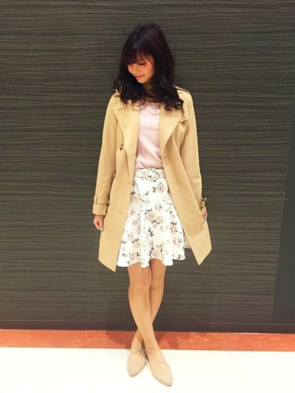春と言えばトレンチコートが鉄板! 花柄スカートもシルエットは可愛らしく、大花柄で大人っぽさを残してくれます! 装飾付のトップスなので胸元が華やかになりネックレスいらずなガーリーコーデに*°
