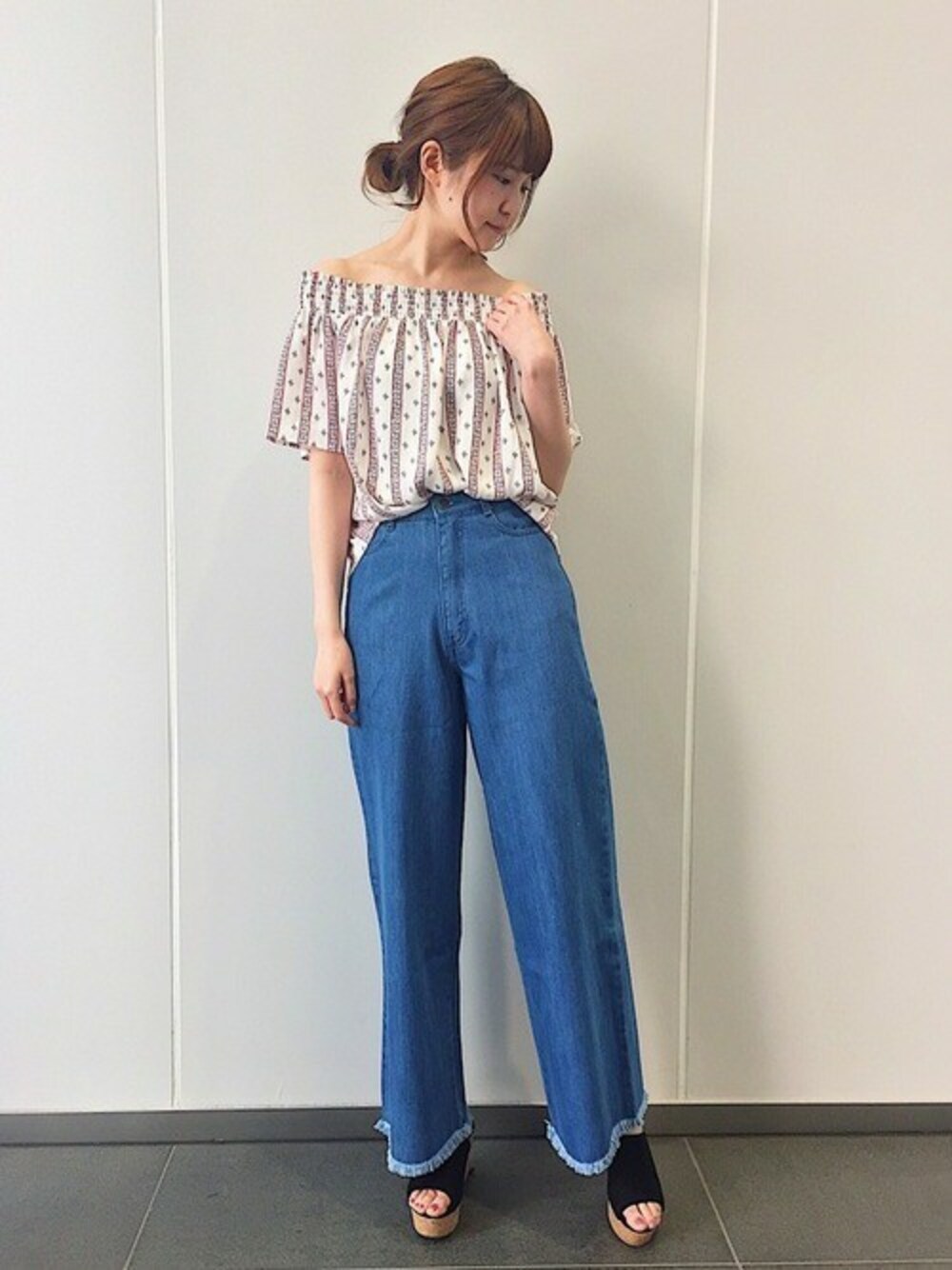 今年注目のエスニック柄がプリントされたオフショルトップスです♡ こちらは肩紐付なのでズレ落ちる心配もなく、2Wayでも着れるタイプでおすすめです! ワイドデニム合わせで今年らしい大人カジュアルスタイルになります♪