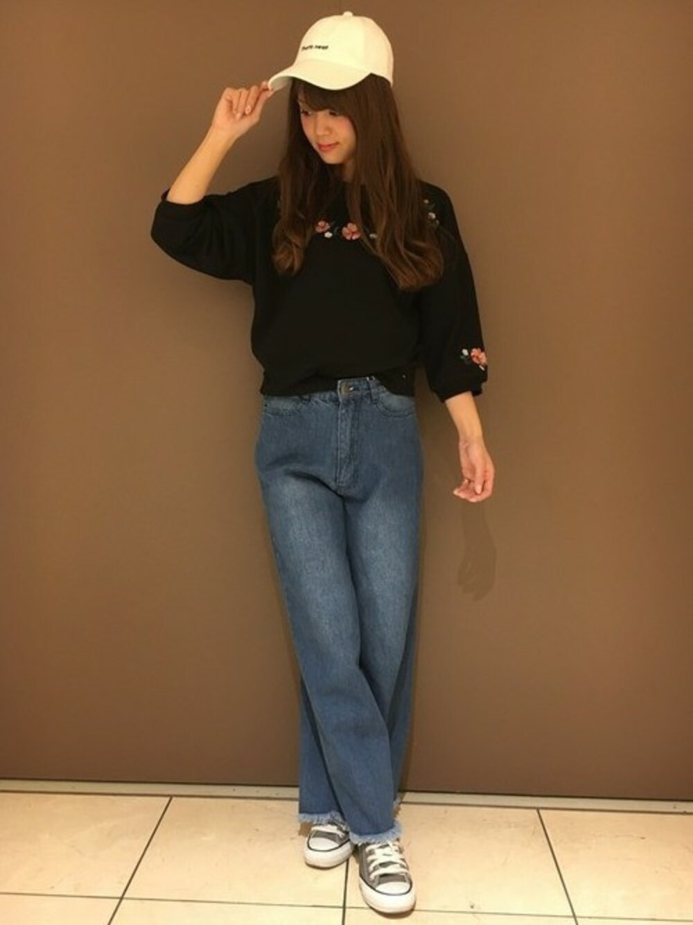 ブラスト加工のデザインのワイドパンツです。 ワイドパンツですが足を綺麗に見せてくれるアイテムです♩ キャップと合わせてカジュアルなコーディネートにしました! スニーカー合わせがオススメです!