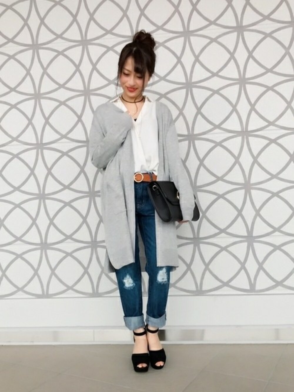 シャツにロングカーデ合わせで知的な雰囲気に。 ユッタリしたこなれ感のあるコーデにはカチッとしたクラッチがバランス良くて◎
