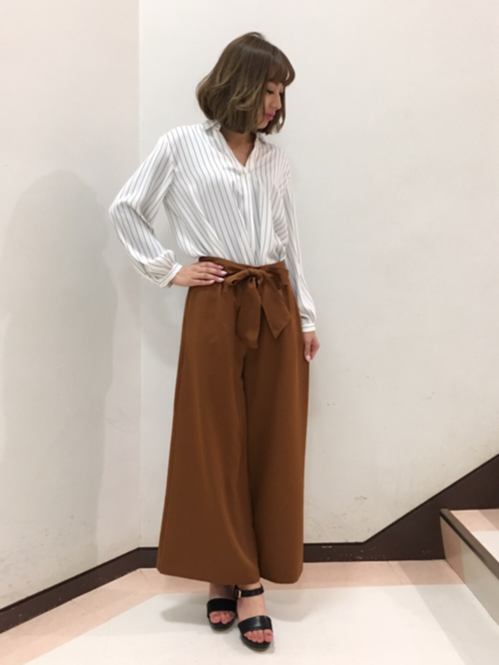 爽やかな印象のストライプシャツ×ブラウンのワイドパンツで大人キレイめコーデにしてみました☆ シャツはこれからの時期何枚か持っていたい着回し抜群アイテムです.+* シワになりにくくお家でお洗濯も出来ちゃう優れものです♪