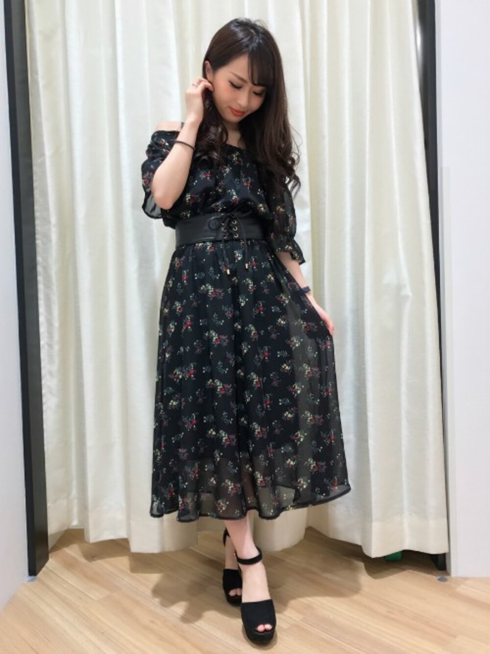 シフォン素材か軽やかになびく大人めワンピです。 オフショルがデコルテラインをきれいに見せてくれます。 ウエストマークはコルセットでメリハリを。 シルエットがとっても素敵な1枚です♪
