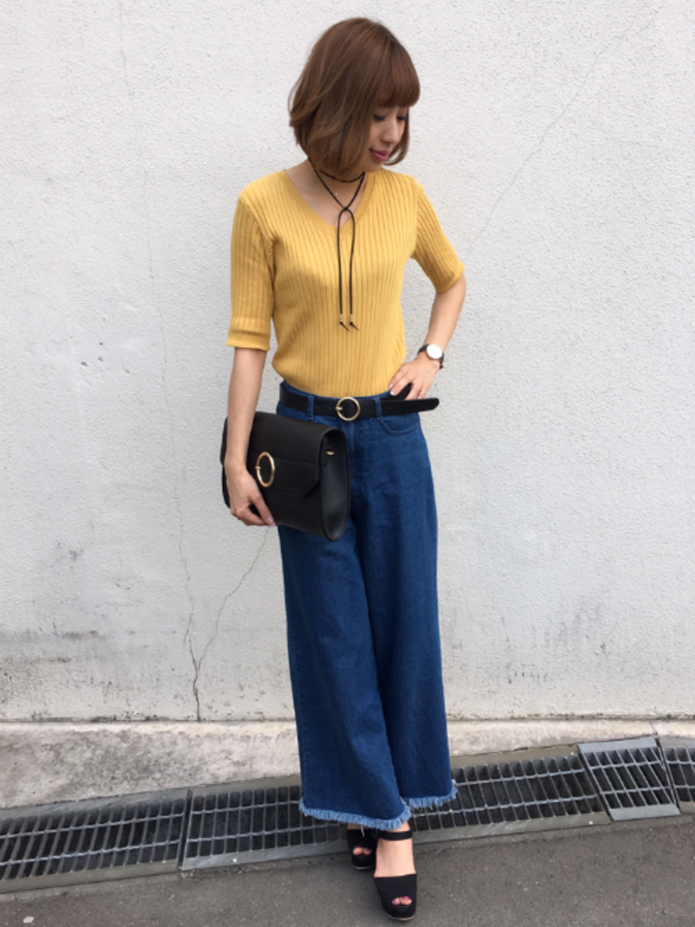 今季トレンドカラーのマスタード!! コーディネートのスパイスとして1枚は持っておきたいカラーです☆☆☆ 薄手のニットトップスは細めのリブがスッキリ見せてくれ、5分袖なので露出を抑えつつ涼しげでこの時期にピッタリな優れものアイテムです♪
