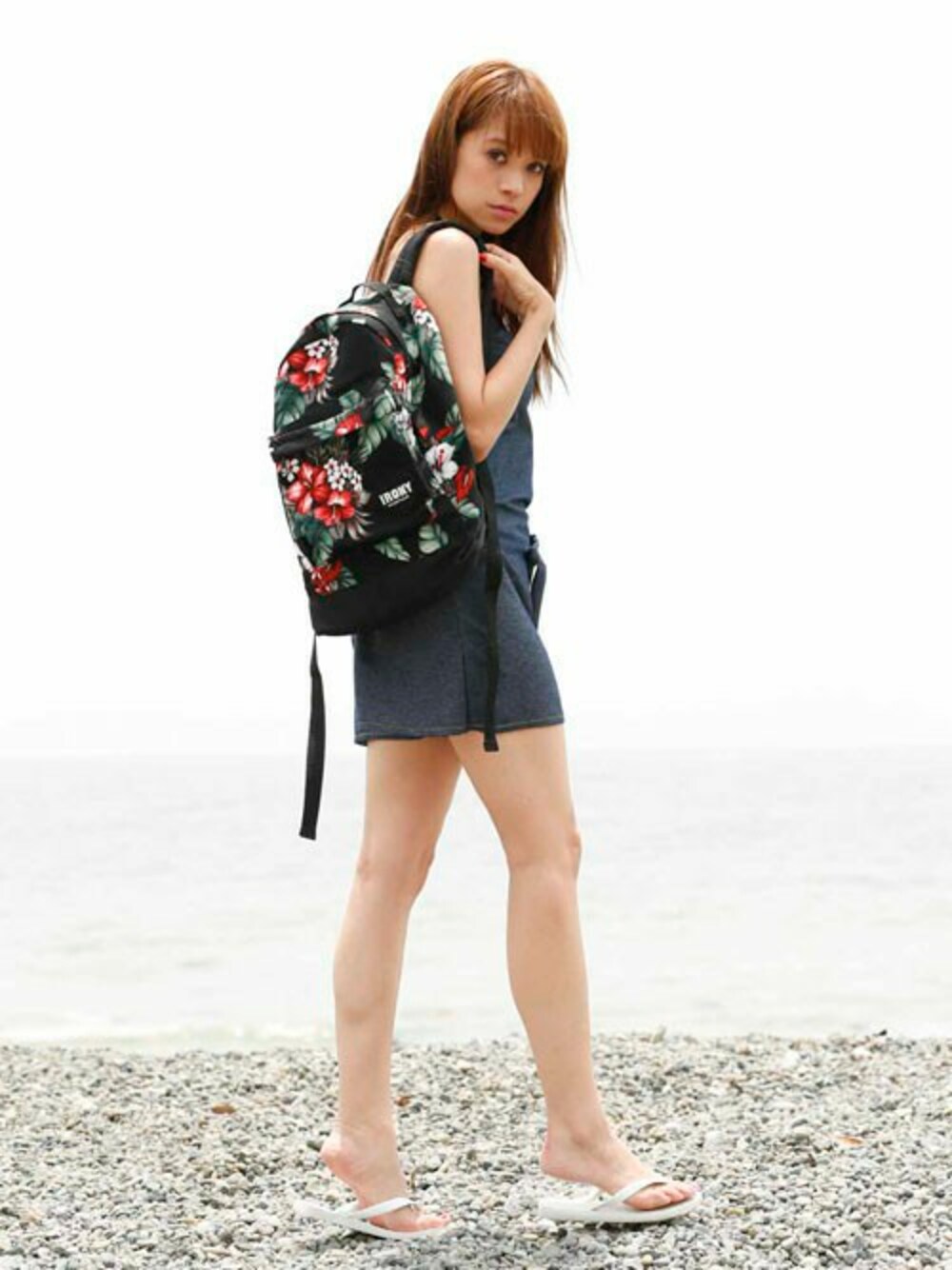 デニムのサロペットの水着は 無地でシンプル!! ボタニカル柄のバックパックを持ったりして みんなの注目を集めちゃいましょう!!