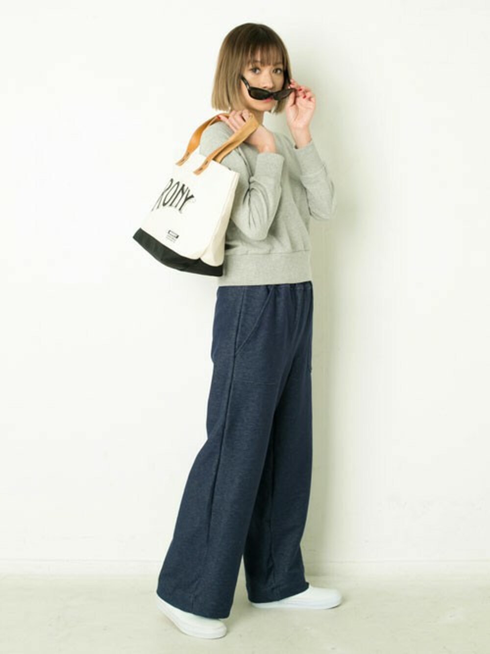 上着なしの季節、クルーネックのスエットに太めのパンツを合わせて ! 大きめトートはなんでも詰め込めるから大好きなアイテム!