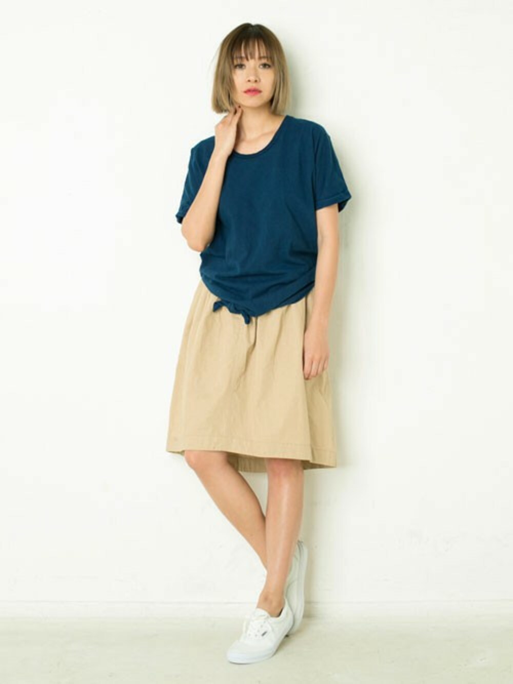 インディゴ染めのトップスは裾をリボン結わき!! ベージュのアシメトリースカートでぺたんこ靴でコーディネート。