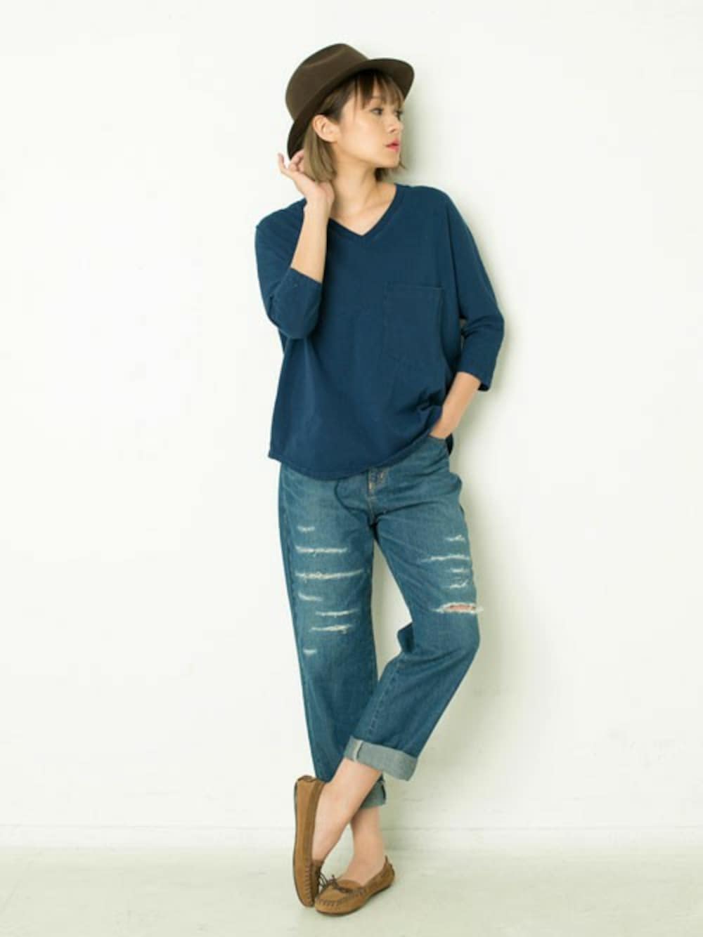 ブルー系のTシャツ/カットソーを着用したレディースの春コーディネートの1枚目の写真