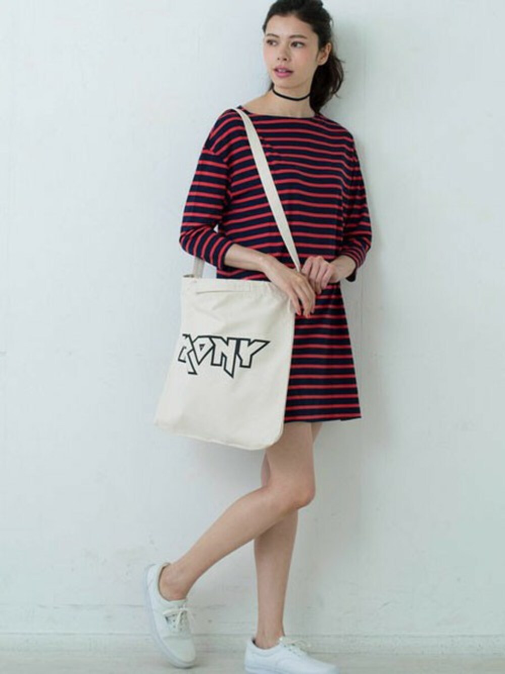 オフショルダーがポイントのボーダーワンピースに、 メタルロゴのトートバッグを合わせたカジュアルスタイル。