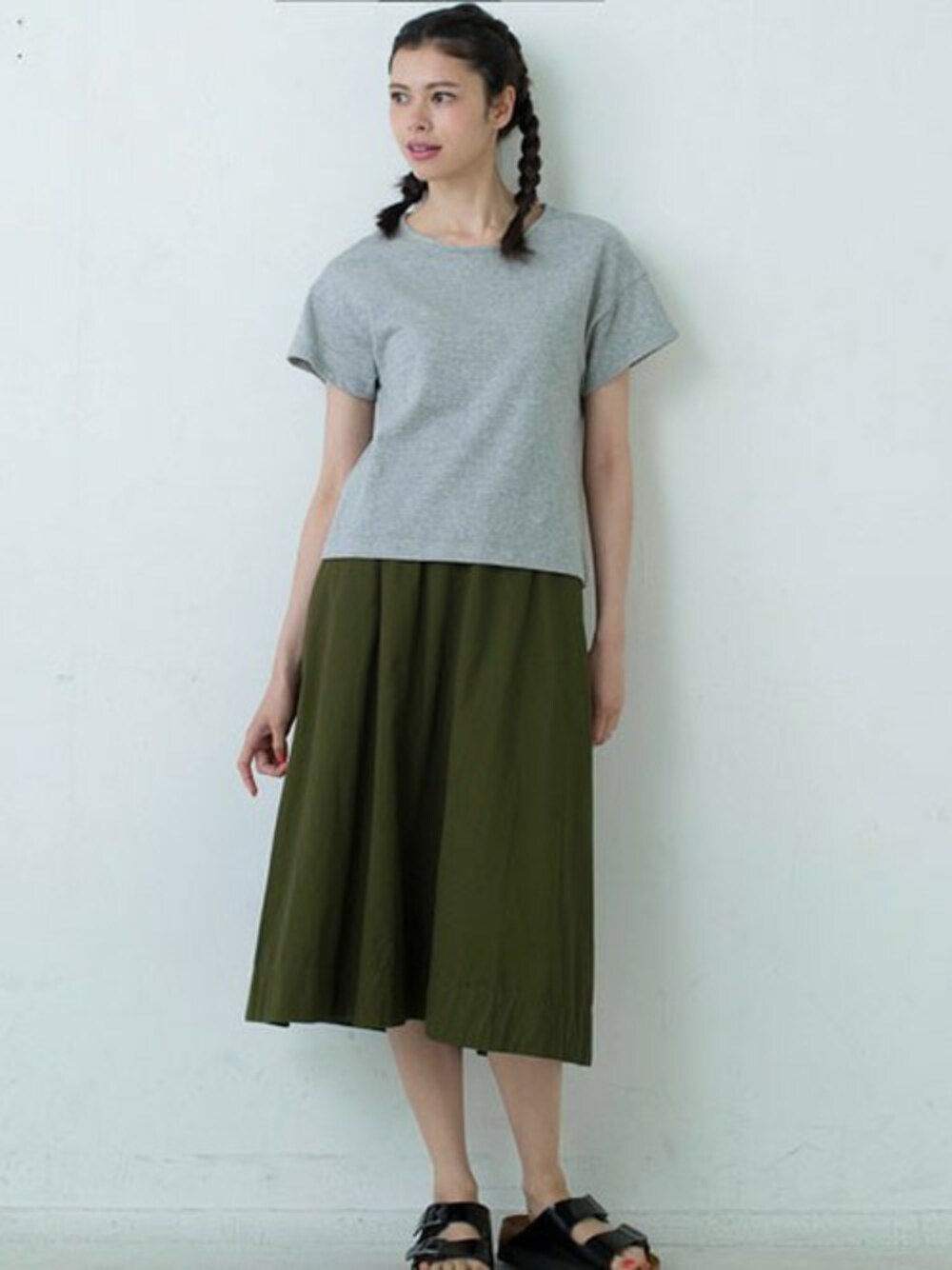 短めトップでバランスをとったカジュアルスタイル。 人気のミモレスカートは落ち着きのあるオリーブを合わせて。