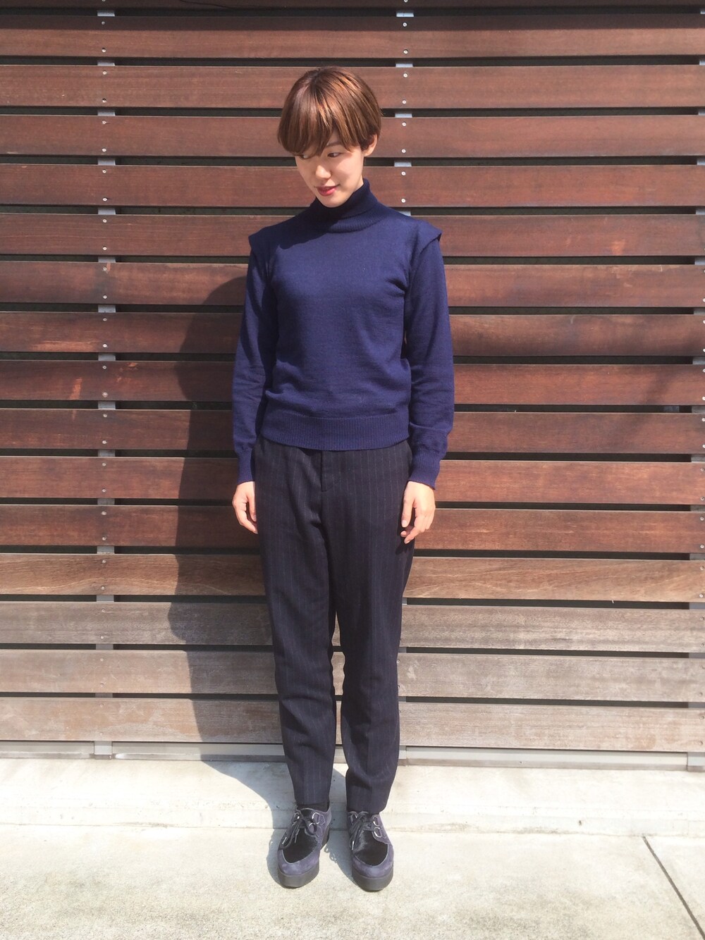 ダークトーンであわせた大人なコーディネート。 秋になると、ネイビーやブラックなど、落ち着いたトーンのアイテムが着たくなります。 フラノ素材のパンツは、少し起毛だった素材感で、冬っぽさを感じさせてくれます。 今年気になるタートルネックは肩にタックを寄せたことで、ベーシックながらも一癖のある仕上がりに。。。