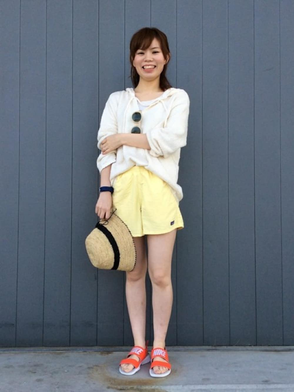 HIKE & CAMP PATAGONIA のバギーズショーツをメインにコーディネートしました。 全体を明るめトーンに統一しました。