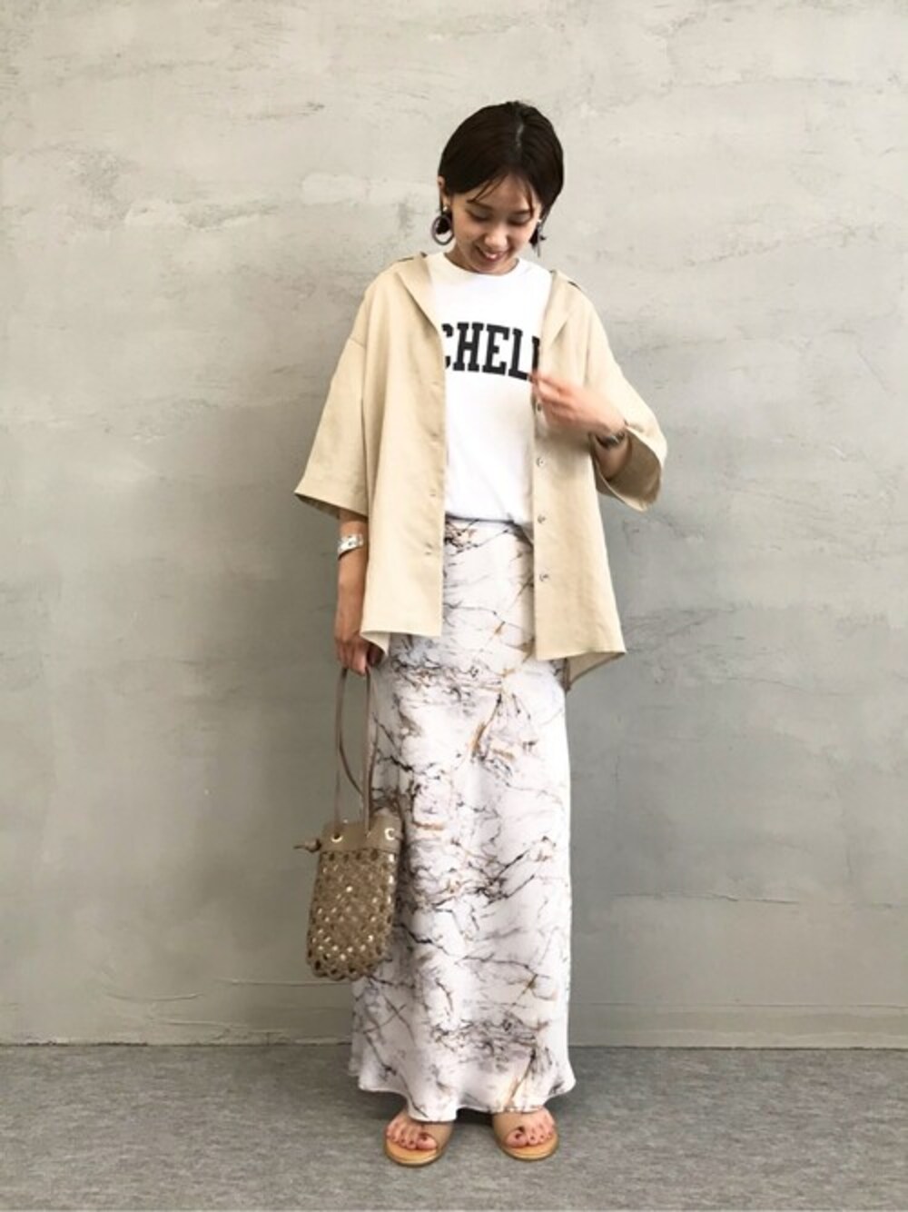 今年トレンドのマーブルプリントのスカートで淡いベージュトーンにメリハリを♩ 一見、柄物って合わせにくそうですが… 白ベースのマーブルプリントなので、どんな色のトップスでも合いますね☺︎ サイズ36着用で足首が隠れる長さ!華奢なサンダルで抜け感出すと季節感でますね☺︎☺︎ 秋にブーツと合わせても◎ マイカのロゴTシャツはオトナなロゴ使いと袖の長さがポイント♩スカートでもパンツでもなんでもハマる万能お洒落アイテムです☆