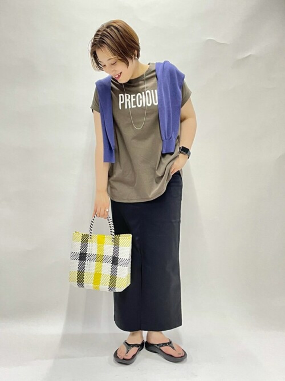 MICA&DEAL(マイカアンドディール)の別注TEEのご紹介! こちらのロゴTEEは着心地とデザイン性が良く、おすすめのアイテム!身幅や丈もしっかりあってどんな体型の方で合うはずです! 袖は少し短いのでカーディガンを合わせるのも◎ ボトムスはフレアスカートでもいいですが個人的にはタイトスカートがおすすめ!タイトだと身長が低くても野暮ったく見えないと思います!