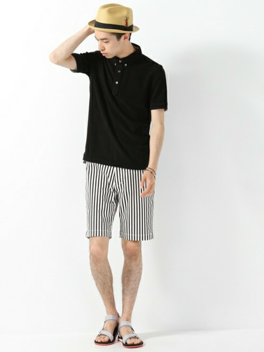 ブラックのパイルポロシャツとストライプショーツで大人の男を演出。パナマハットとストラップサンダルは夏には欠かせないマストアイテムです。