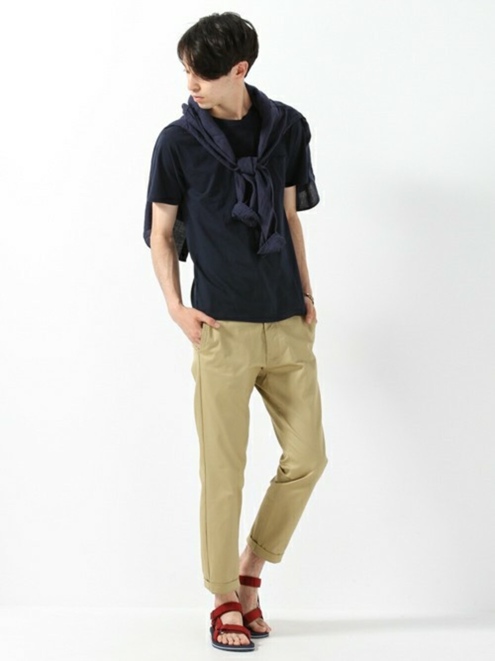 トップスはネイビーでまとめ、パンツは光沢のあるしっかりとしたコットンパンツを合わせ、大人の男を演出。レッドのストラップサンダルで抜け感がグッと際立ちます。