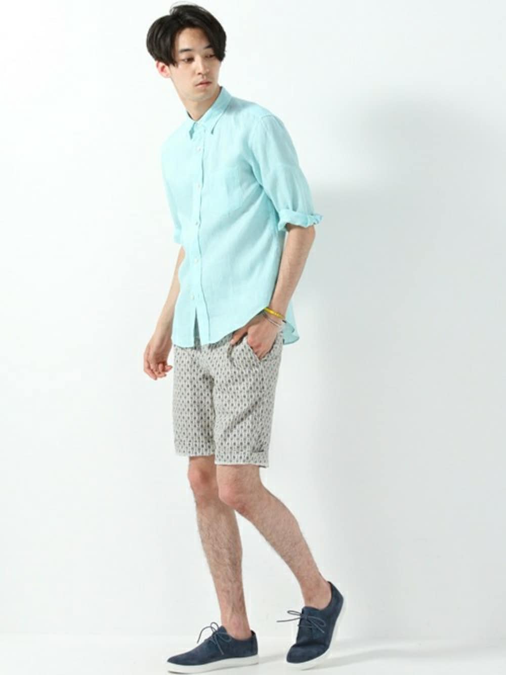 スカイブルーのリネンシャツに、スエードのスニーカーを合わせた斬新なスタイリング。今夏是非試して頂きたい組み合わせです。