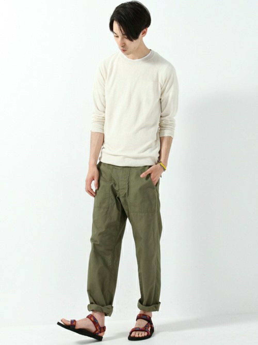 ホワイトのリネンニットに、カーキのパンツを合わせた大人の印象が引き立つコーデ。サンダルを合わせ夏らしさが更に引き立ちます。