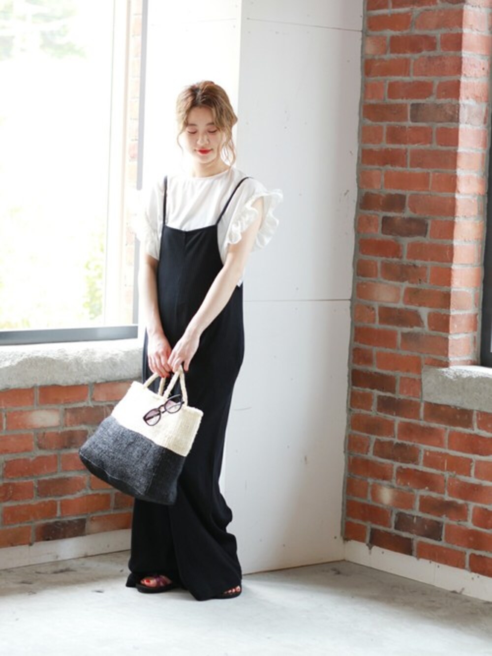 ◆リブニットのサロペット 甘めのフリルブラウスをルーズなサロペットで合わせ、大人のリラックススタイルに。