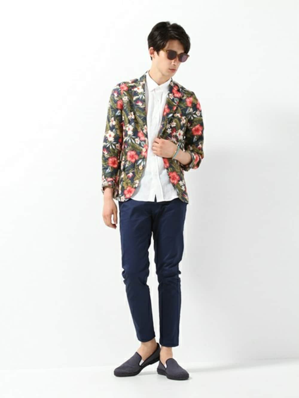 テーパードのきいたパンツにサングラスを合わせ、トレンドを意識したサマースタイルに。トロピカルなジャケットはコーデのアクセントになります。