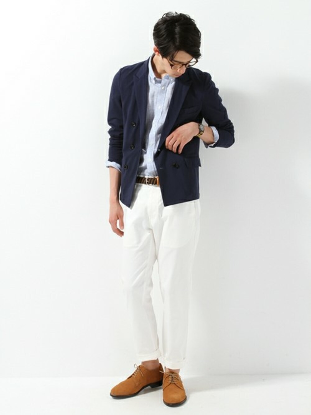 ネイビージャケットにホワイトパンツを合わせたキレイめスタイリング。スエードのキャメルシューズがこなれた印象です。