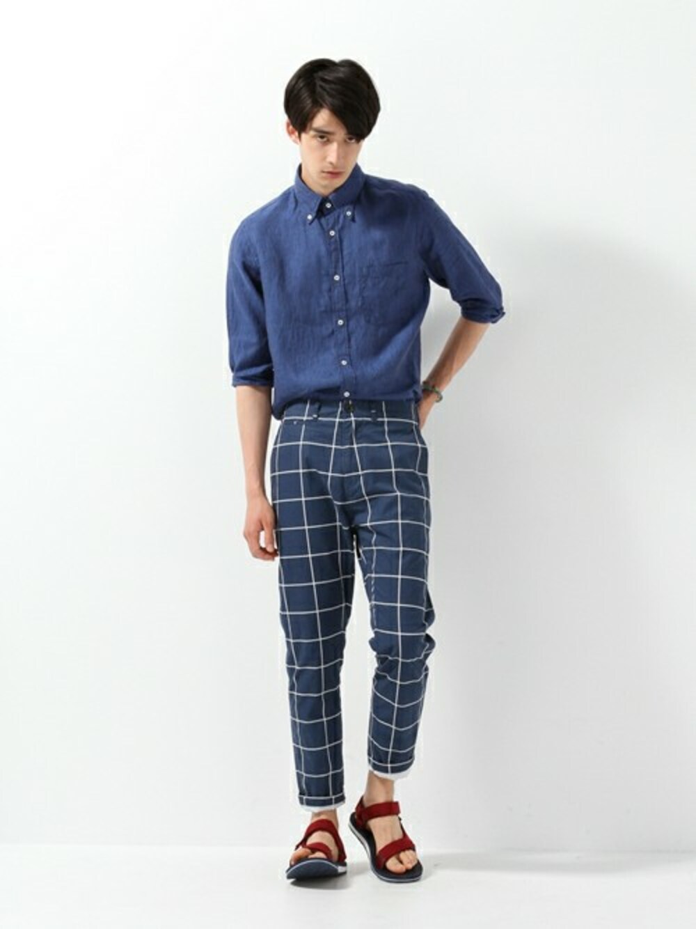 全体をネイビーで統一し、チェックパンツが目を引くコーデ。サンダルを合わせ、こなれ感を演出しています。