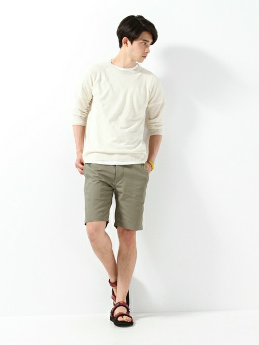 ホワイトリネンニットにカーキのショーツがうまくマッチしたスタイリング。サンダルをチョイスし、サマールックな雰囲気をプラスしました。