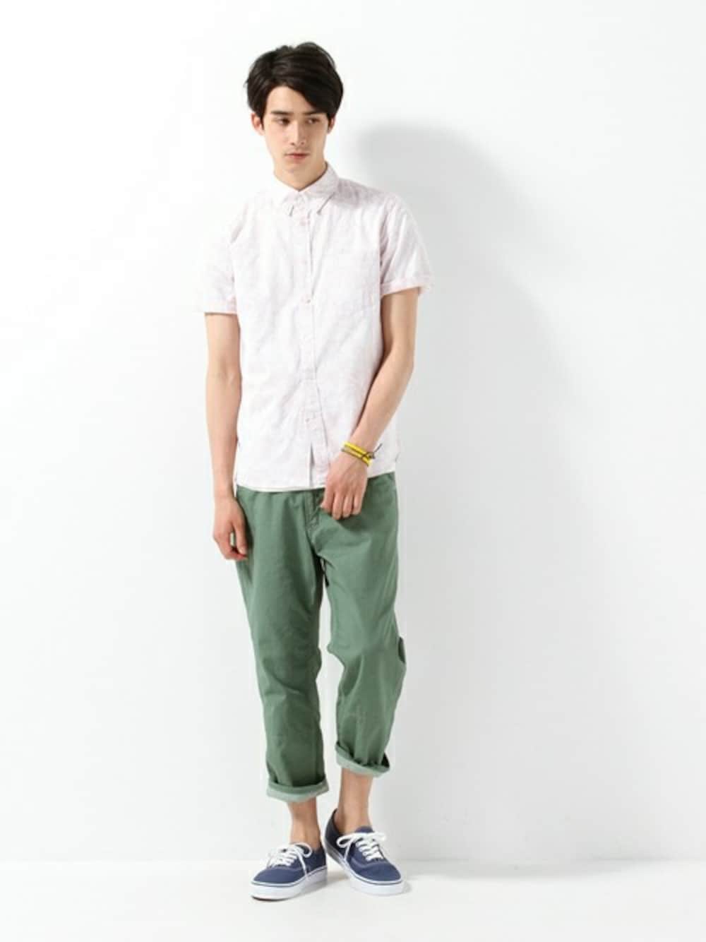ライトネイビーカラーシャツにカーキクロップドパンツが相性のよいコーデです。足元にはネイビーのVANSを合わせる事でこなれた印象を演出します。