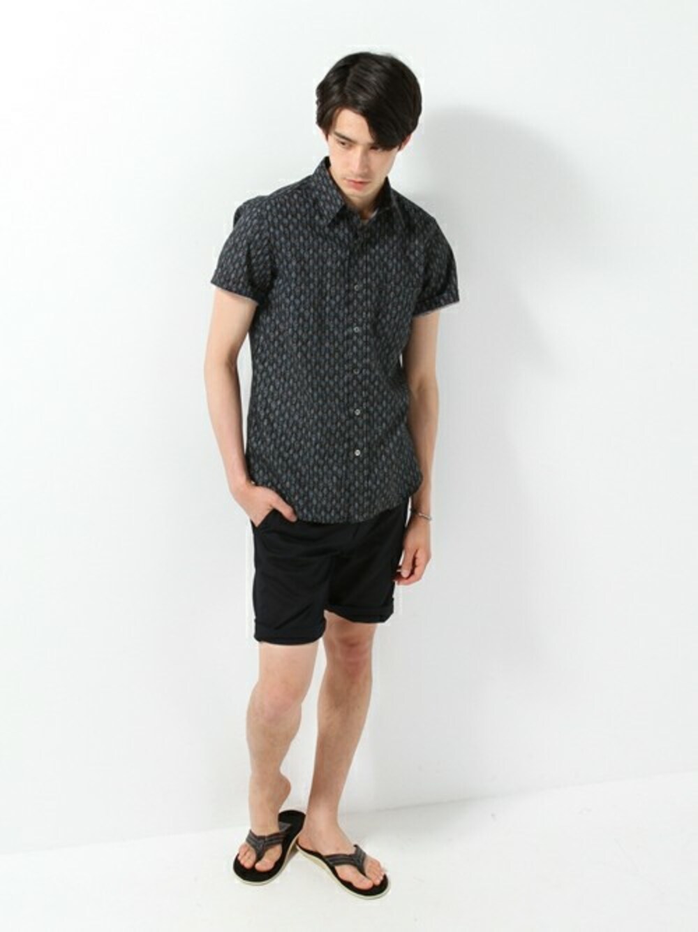 ダークトーンの柄半袖シャツにブラックショーツを合わせた クールな印象のスタイリングです。 レザーブラックサンダルは全体の印象をキリッとさせます。