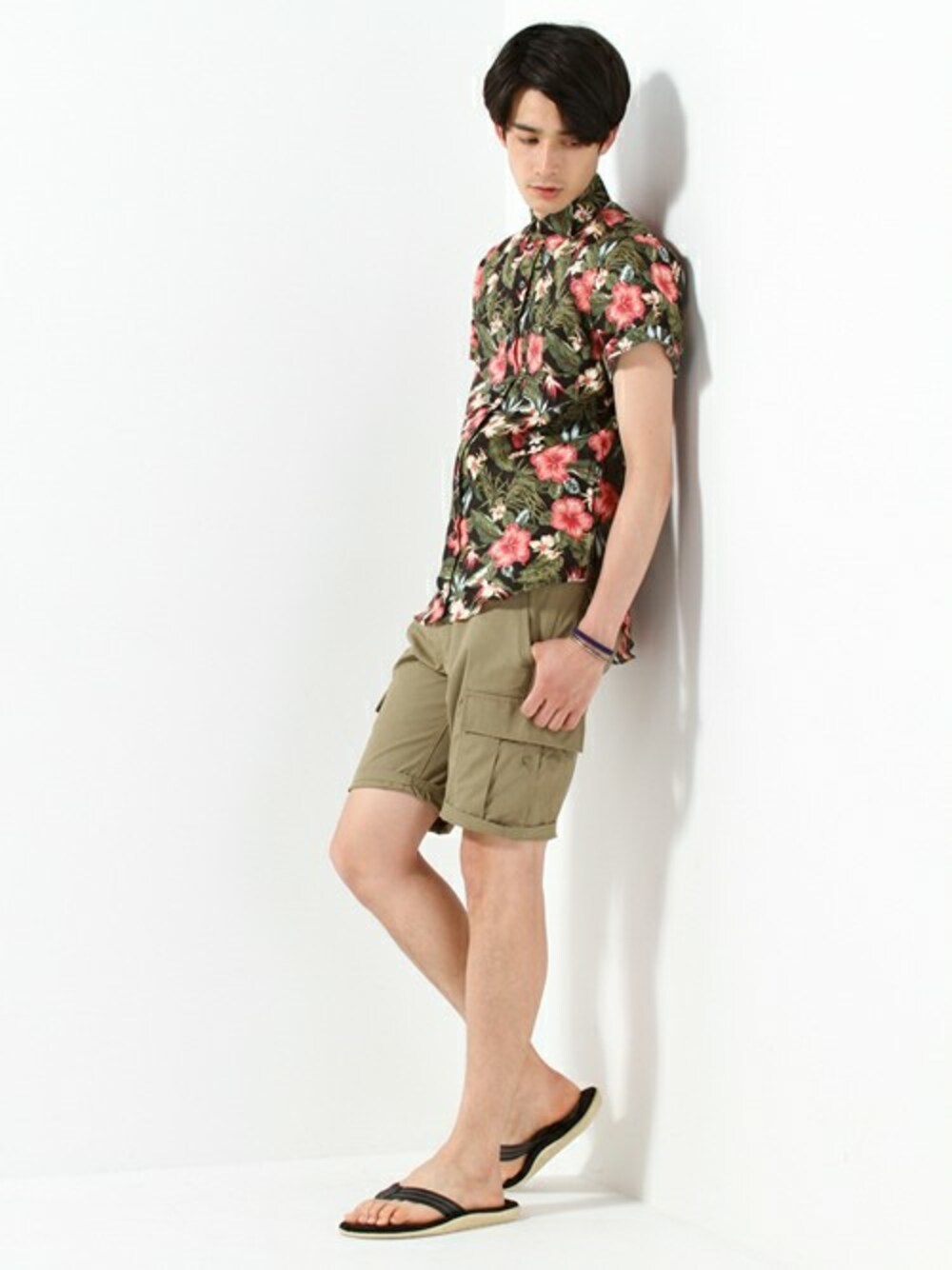 花柄シャツとベージュショーツが夏を感じさせるスタイリングです。ブラックサンダルが雰囲気全体を引き締めます。
