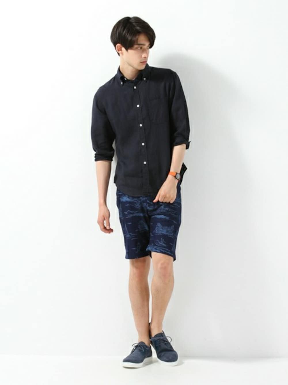 全体をネイビーでまとめたスタイリング。 ネイビーリネンシャツと、ブルー系柄ショーツで落ち着きのあるサマールックを演出します。