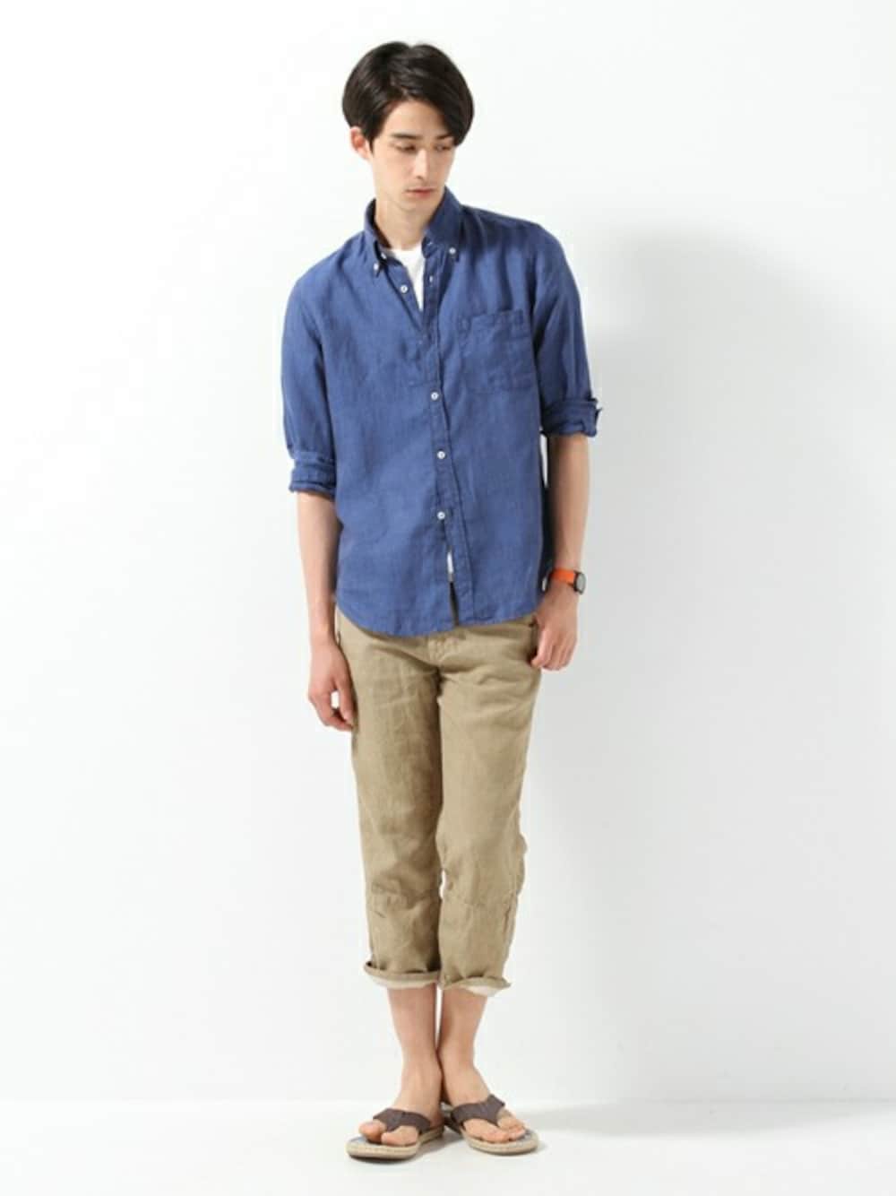 ライトブルーリネンシャツに、同素材のベージュパンツを合わせた 夏コーデです。ショーツに抵抗がある方は是非お試し頂きたいスタイリングです。