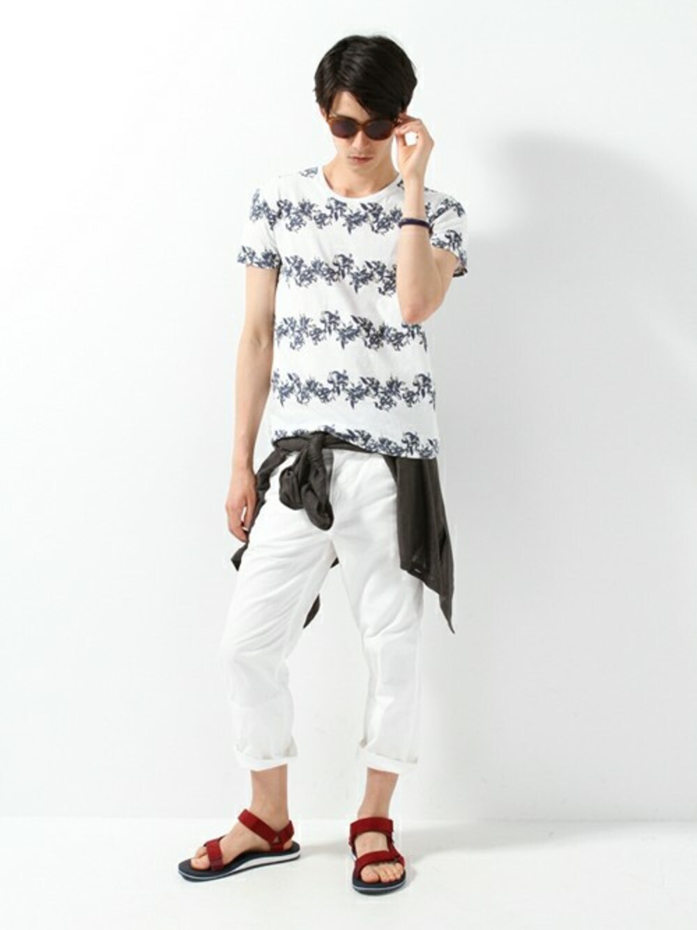 珍しい柄のTシャツにホワイトのパンツを合わせ、 白を基調としたスタイリングです。 サングラスがコーデのアクセントになります。