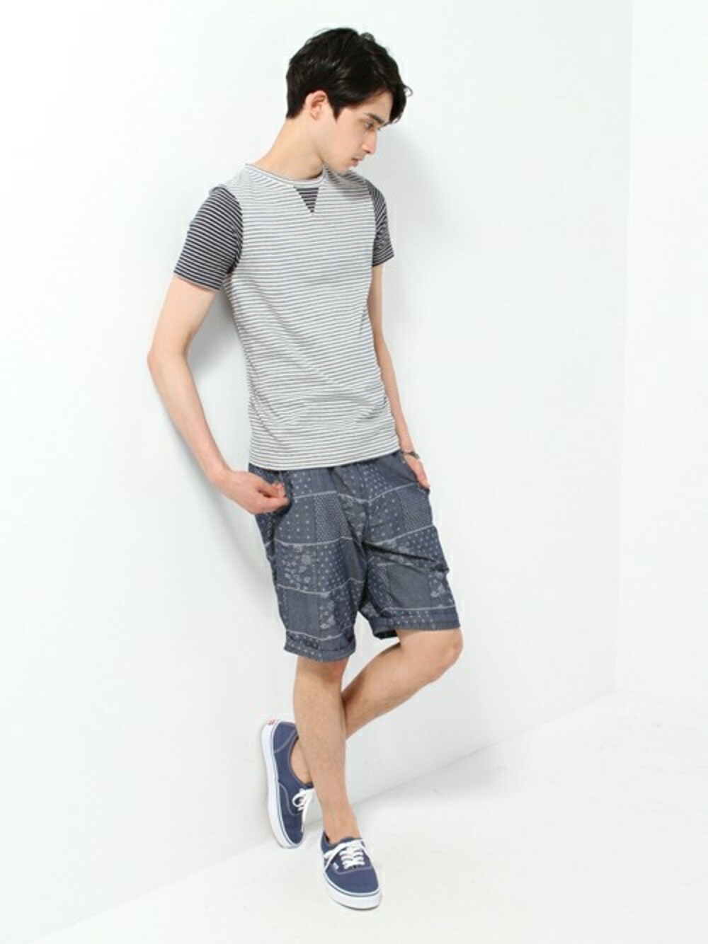 全体的に淡い色味で統一したスタイリング。グレーの柄ショーツが全体の雰囲気を引き締めます。