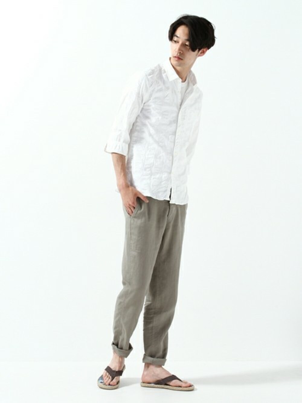 ホワイトシャツにリネンパンツを合わせたナチュラルサマースタイルです。 サンダルにはトロピカル柄がプリントされており、非常に目を引くイチオシアイテムです。
