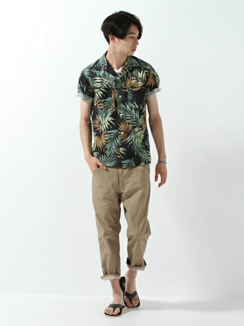 ブラックトーンのアロハシャツに、ベージュパンツを合わせ、落ち着いた印象ながら夏を感じさせるコーデです。