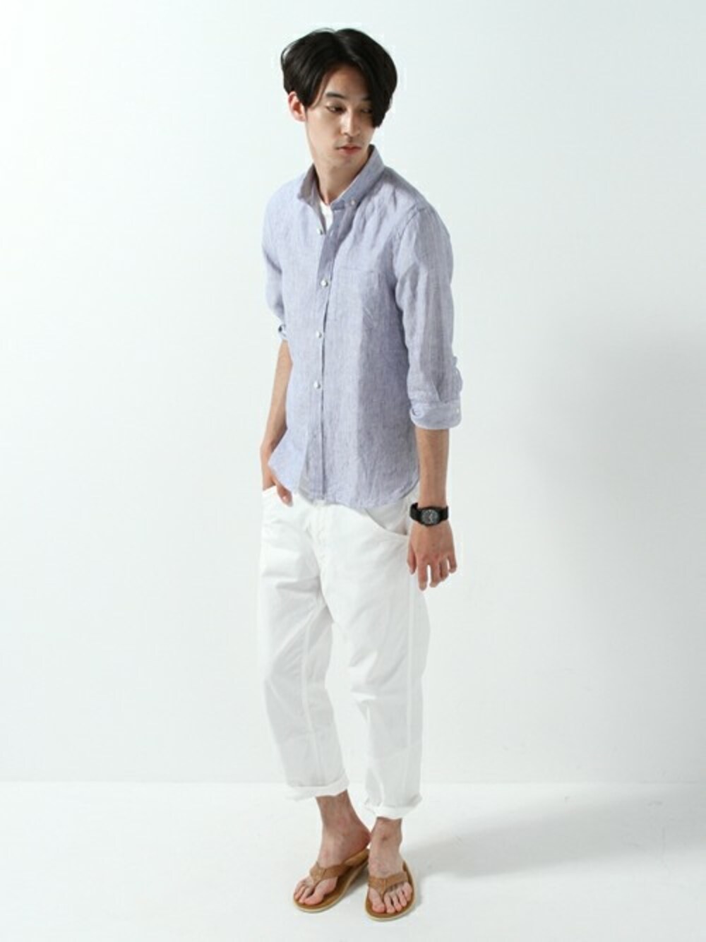 ライトブルーのリネンシャツに、ホワイトパンツを合わせ、大人サマ―を演出。レザーサンダルは抜け感を演出できるアイテムです。