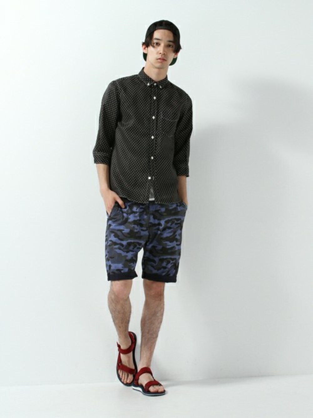 ドットシャツにネイビーのカモリバーシブルショーツを合わせた メリハリのあるコーデです。全体をダークトーンでまとめ、 落ち着いたスタイリングに。