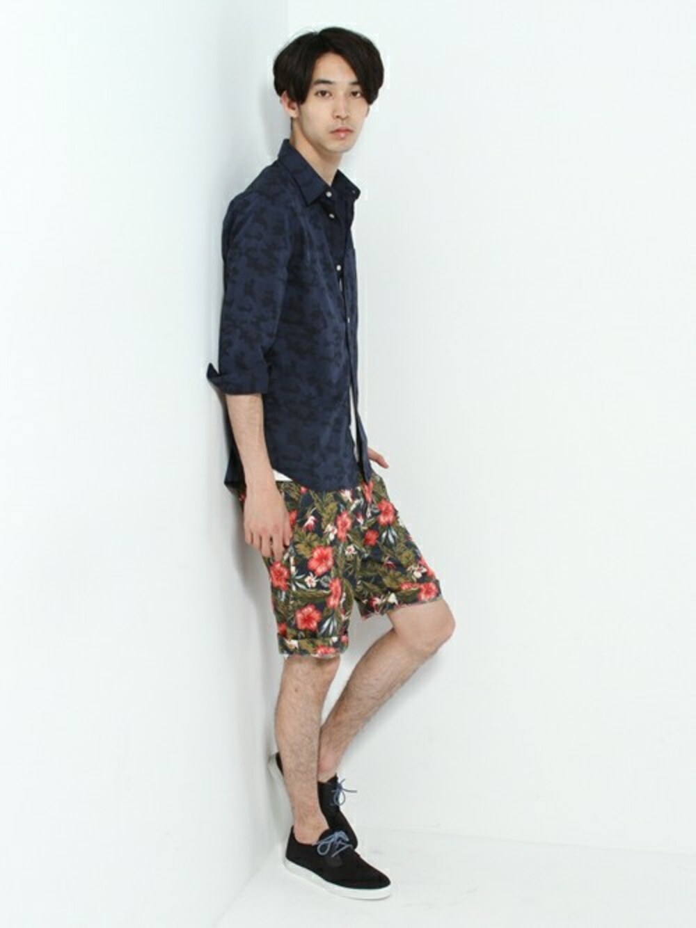 ネイビーカモフラシャツに花柄ショーツを合わせ、メリハリのあるコーデに。