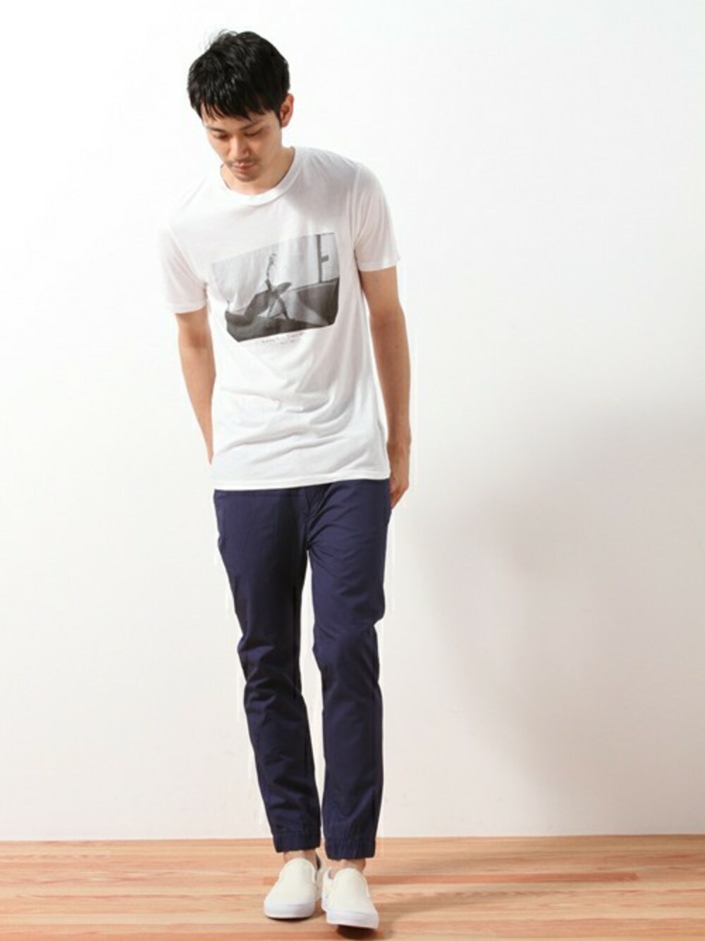 ニューヨークを拠点に活躍する写真家ジェフリージョーンズのフォトグラフィックTシャツにシャープなシルエットのアンクルパンツを合わせたシンプルスタイル。